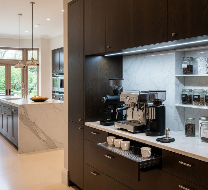 Celebrity trend: Built-in coffee bars, wine fridges, or even kombucha taps.