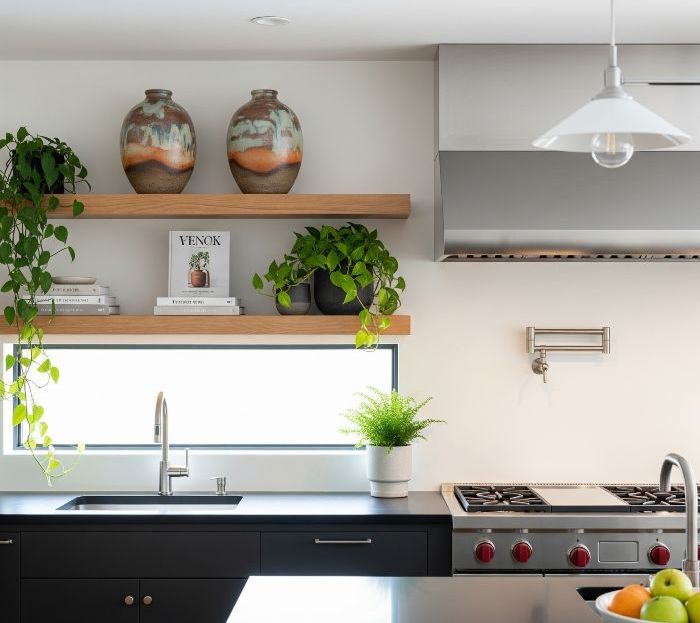 DIY update: Remove cabinet doors or install a floating shelf. Decorate with what you already have—group neutral dishware, stack wooden cutting boards, and add a small potted herb or trailing plant.